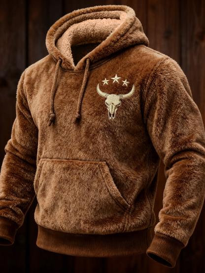 Men's Western Bull Skull Embroidered Cozy Plush Hoodie