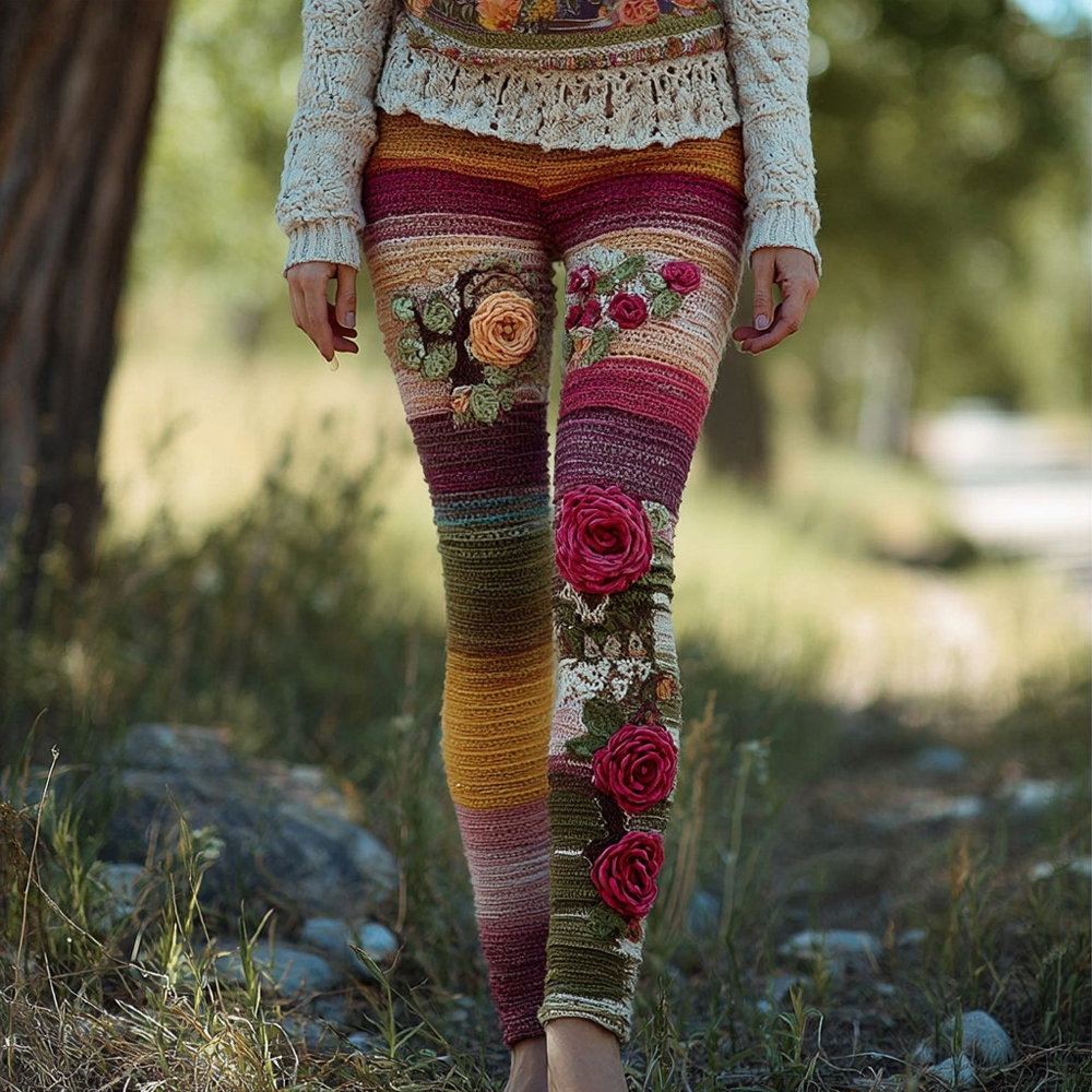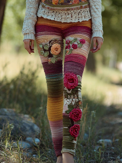 Retro Bohemia Flower Crochet Striped Cozy Knit Leggings