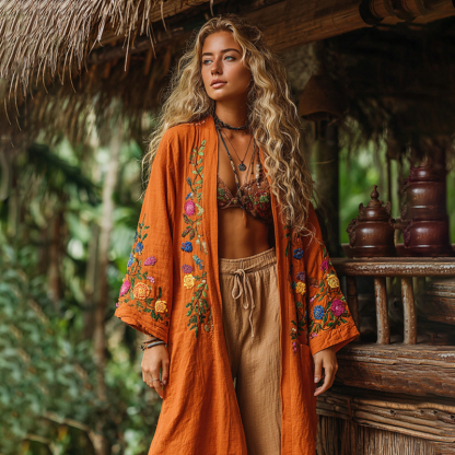 Retro Bohemian Floral Art Embroidery Print Cotton And Linen Blend Midi-length Kimono Cardigan