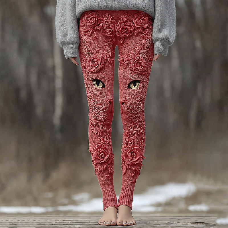 Vintage Cute Cat Face With Roses Art Embroidered Cozy Knit Leggings