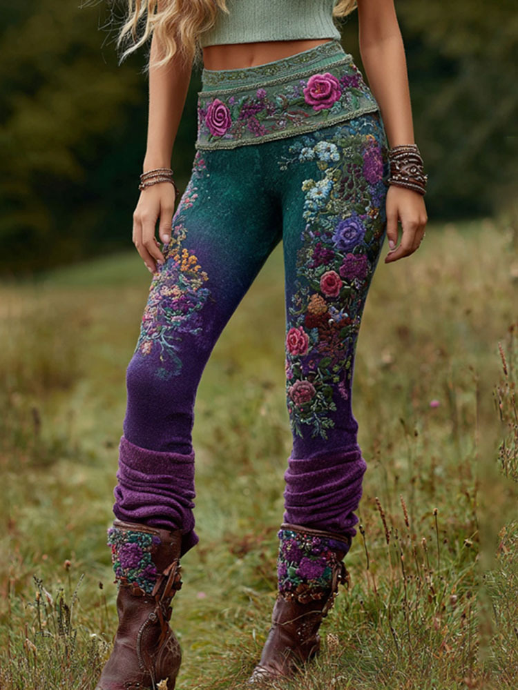 Vintage Purple Lavender And Floral Embroidered Casual Leggings