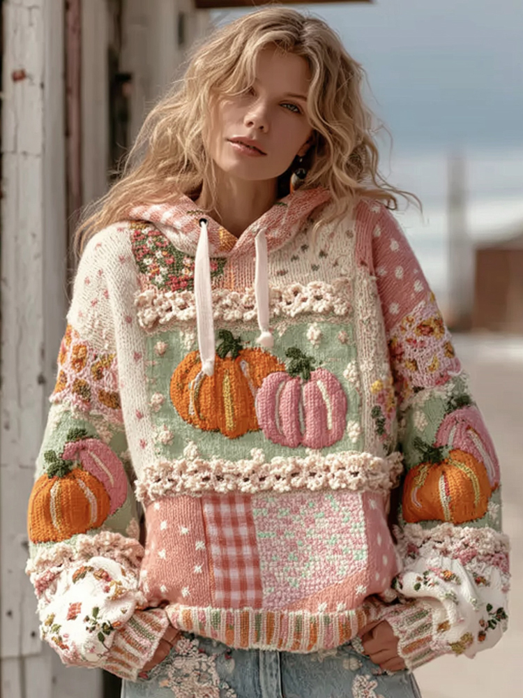 Women's Colorful Pumpkin Knit Colorblock Cozy Hooded Sweater
