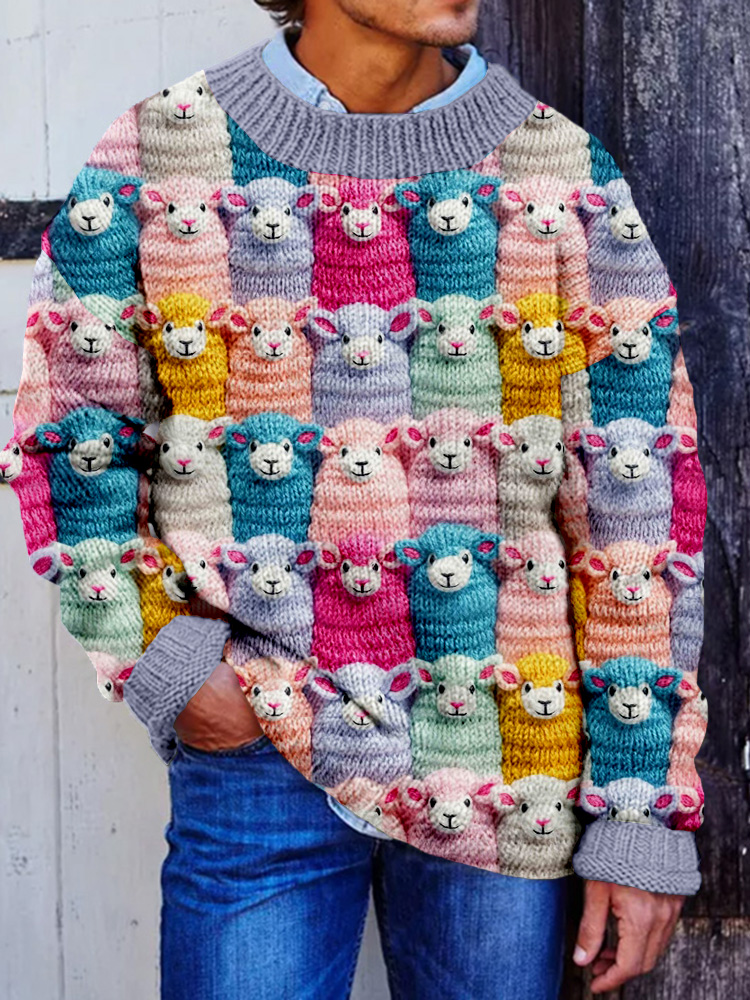 Men's Cute Farm Pastel Sheep Embroidered Cozy Knit Sweater
