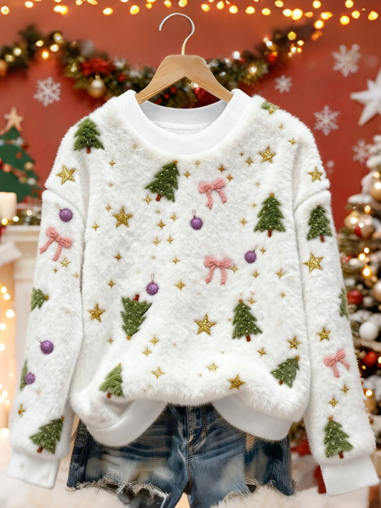 Cute Bow And Christmas Tree Pattern Warm Crew Neck Sweater