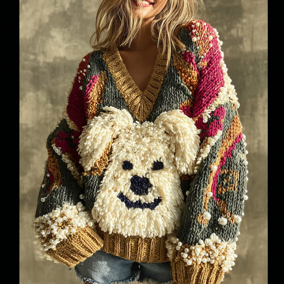 Lady Retro Cute Dog Plush Comfortable Knitted Sweater.