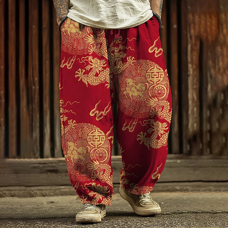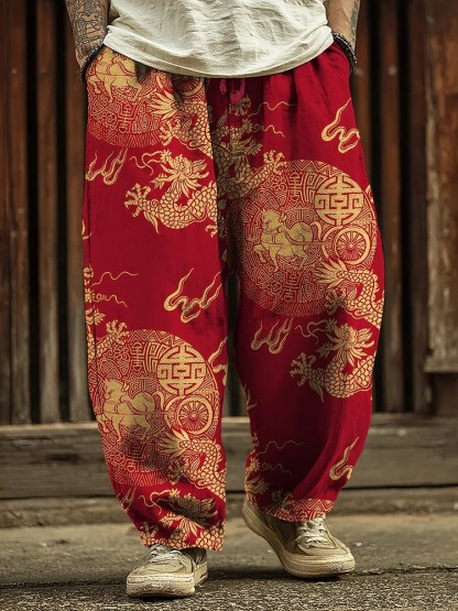 Men's Classic Traditional Gold Dragon And Bronze Coin Print Casual Pants