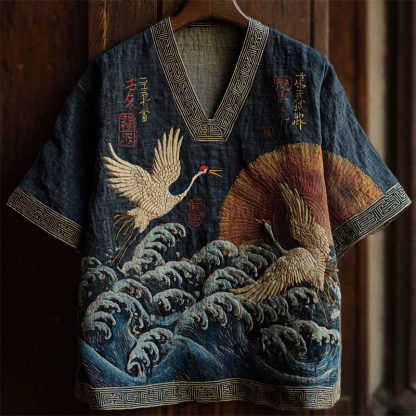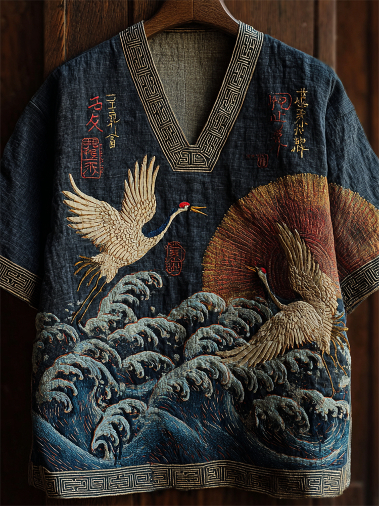Men's Japanese Cranes & Sea Waves Sunrise Linen Shirt