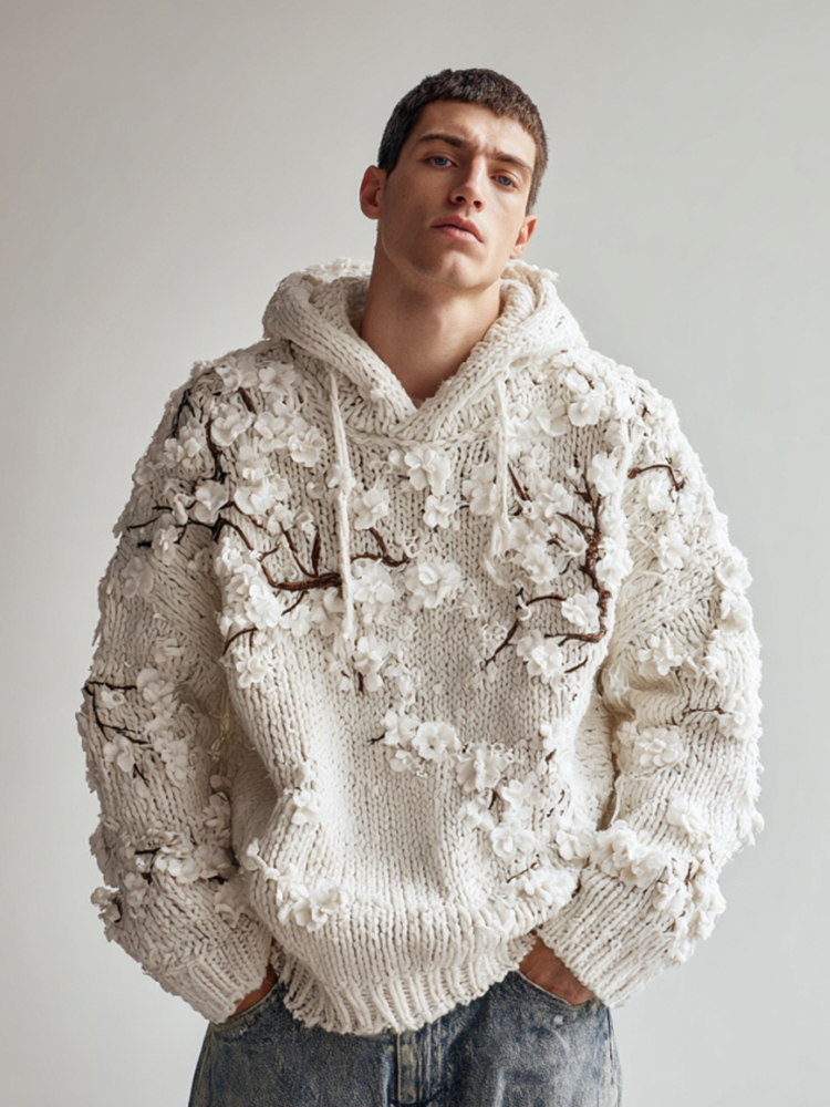 Men's Japanese White Almond Blossom Warm Hooded Sweater
