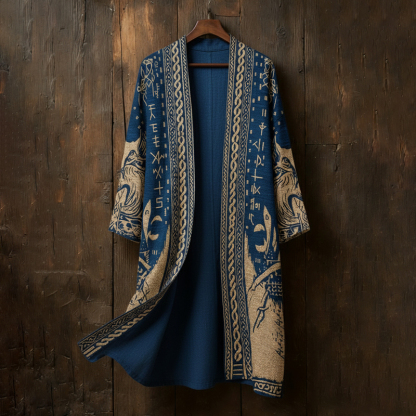 Men's Retro Viking Rune And Wolf Print Casual Blend Long Cardigan