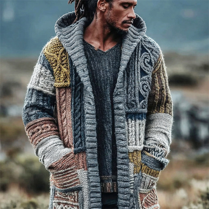 Vintage Geometric Patchwork Men's Chunky Knit Hooded Cardigan