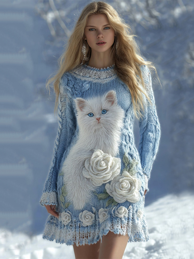 Women's Cute White Cat White Rose Pattern Cozy Knit Mini Sweater Dress