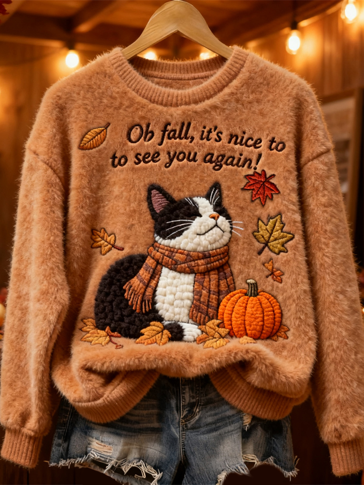 Thanksgiving Pumpkin Cat Embroidered Women's Soft Fleece Sweater