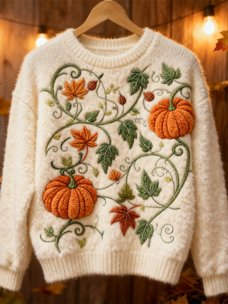 Thanksgiving Pumpkin Embroidered Women's Knit Sweater