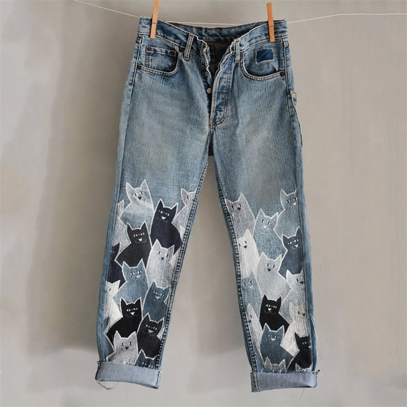 Cat Colorblock Art Paw Print Embroidered Washed Jeans