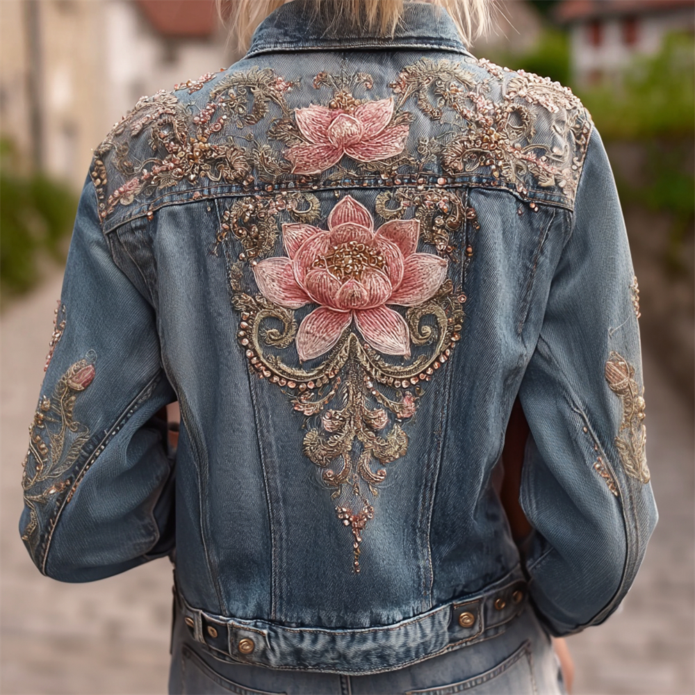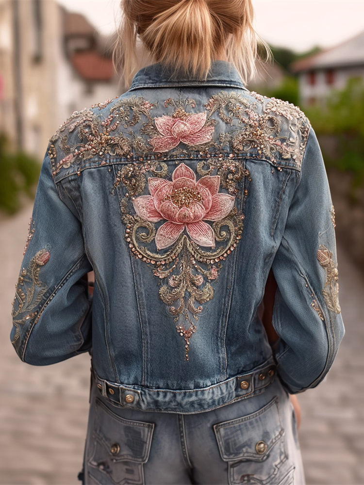 Bohemian Lotus Sequins Embroidered Vintage Women's Denim Jacket