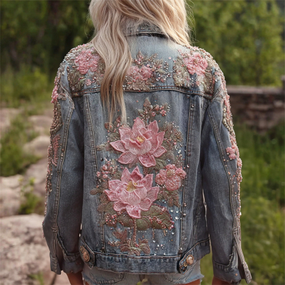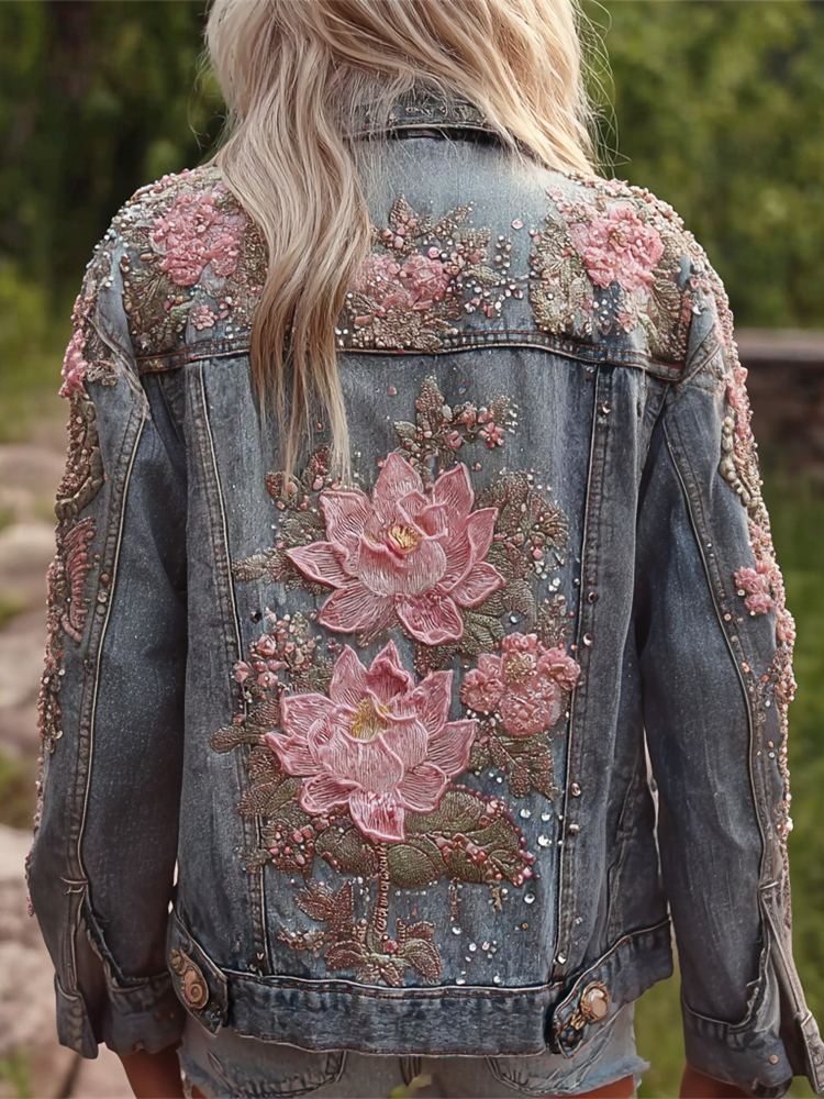 Bohemian Lotus Sequins Embroidered Vintage Women's Denim Jacket