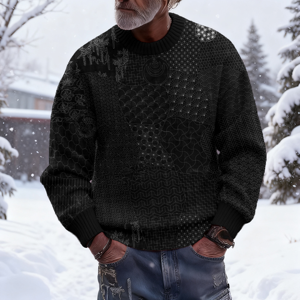 Men's Japanese Traditional Sashiko Art Pattern Cozy Knit Sweater