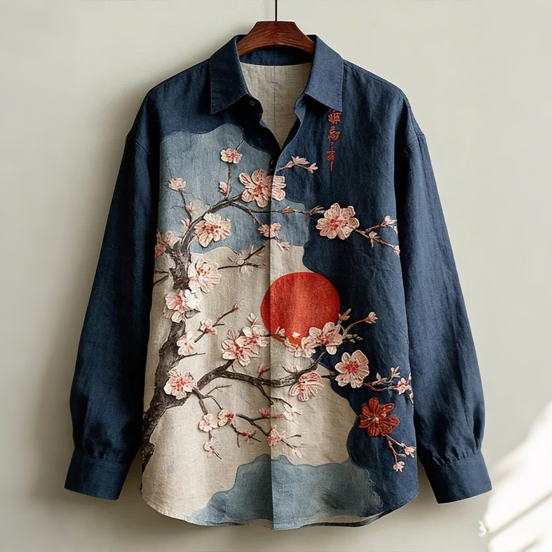 Men's Retro Japanese Cherry Blossom Art Print Long-sleeved Shirt