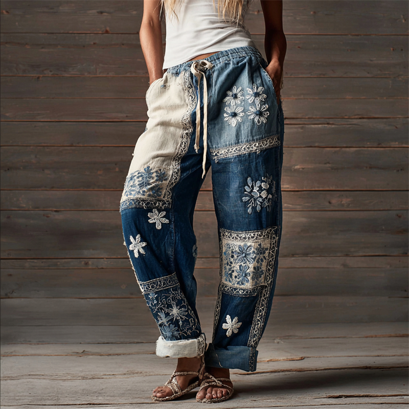 Boho Floral Embroidered Colorblock Patchwork Casual Linen Pants