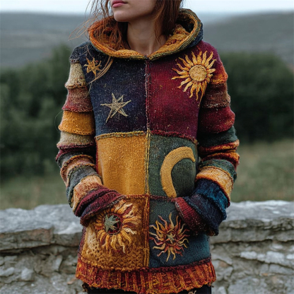 Boho Sun & Moon Floral Embroidered Colorblock Cozy Knit Hooded Sweater
