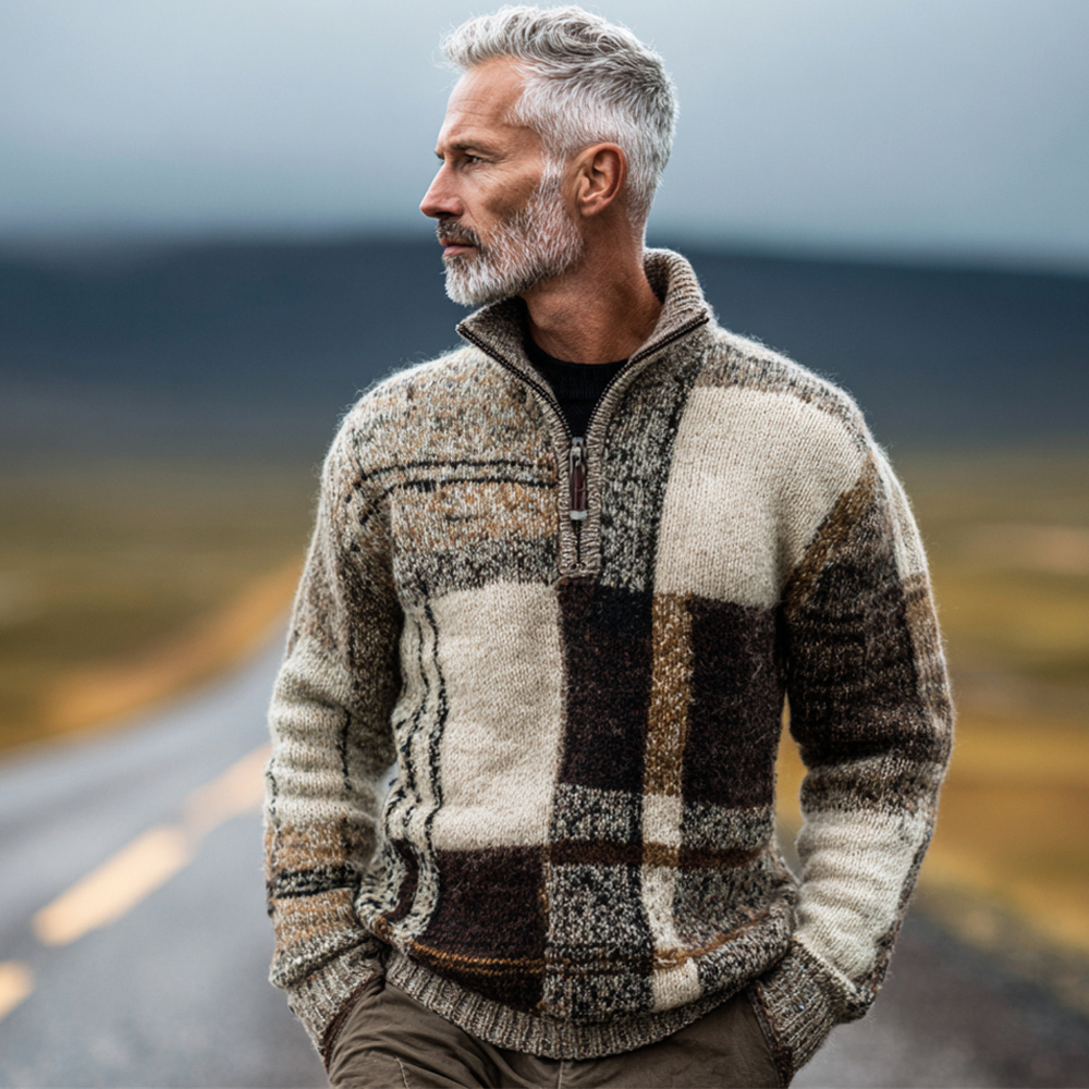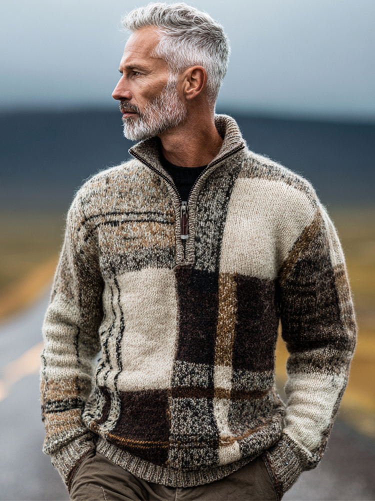 British-style Checkered Patchwork Men's Zipper-collar Knit Sweater For Fall/winter