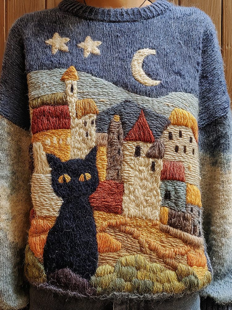 Fairytale Cottage With Cute Black Cat Inspired Embroidered Cozy Knit Sweater