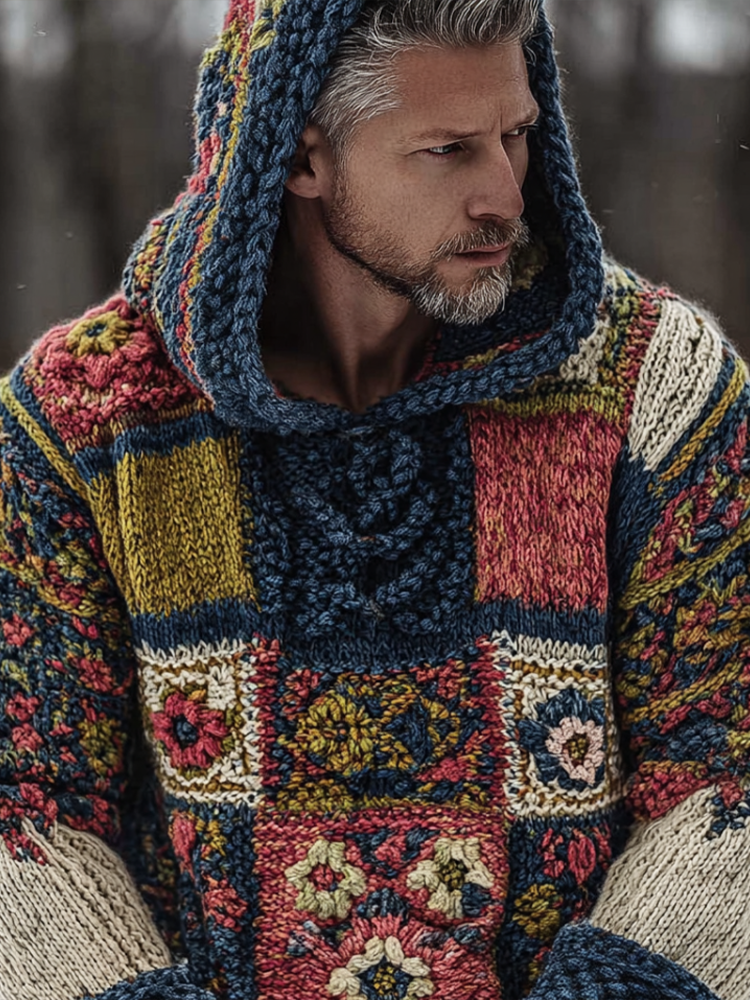 Japanese Art Style Geometric Color Block Patchwork Plant Flower Embroidery Men's Hooded Knit Sweater