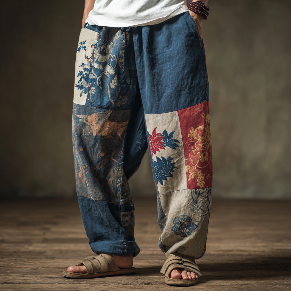 Japanese Art Style Plant Flower Embroidery Men's Casual Cotton And Linen Long Pants