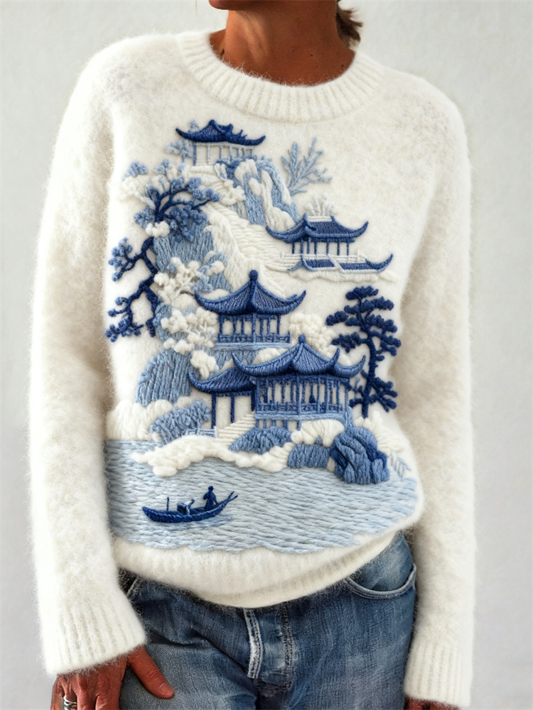 Japanese Buildings Pine Trees Mountain Landscape Embroidered Cozy Sweater
