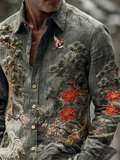 Japanese Pine & Chrysanthemum Embroidery Men's Long Sleeve Shirt