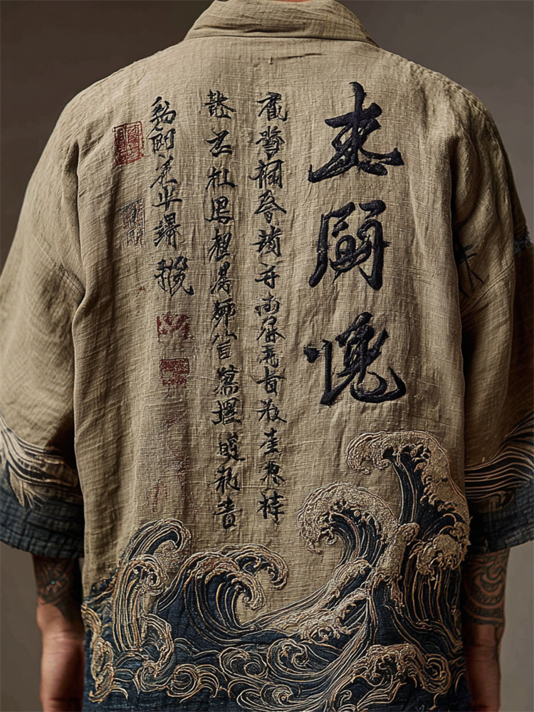 Japanese Sea Waves Calligraphy Art Embroidered Linen Kimono Cardigan