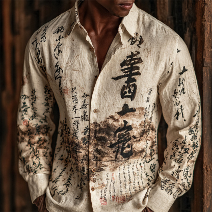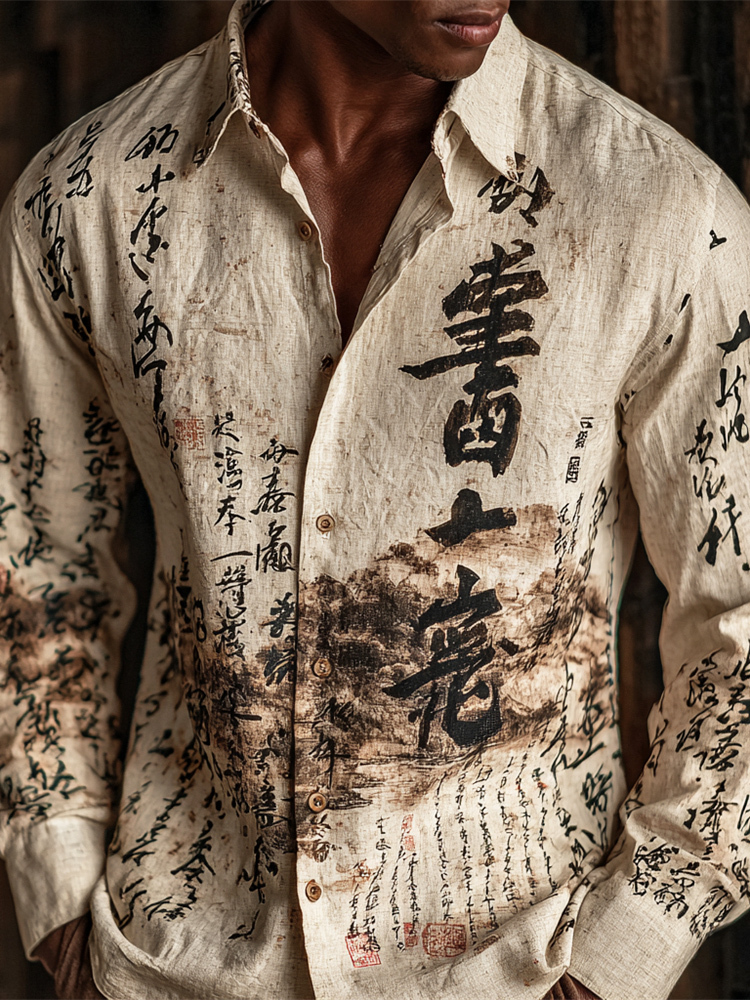 Japanese Zen Calligraphy Men's Linen Long-sleeve Shirt