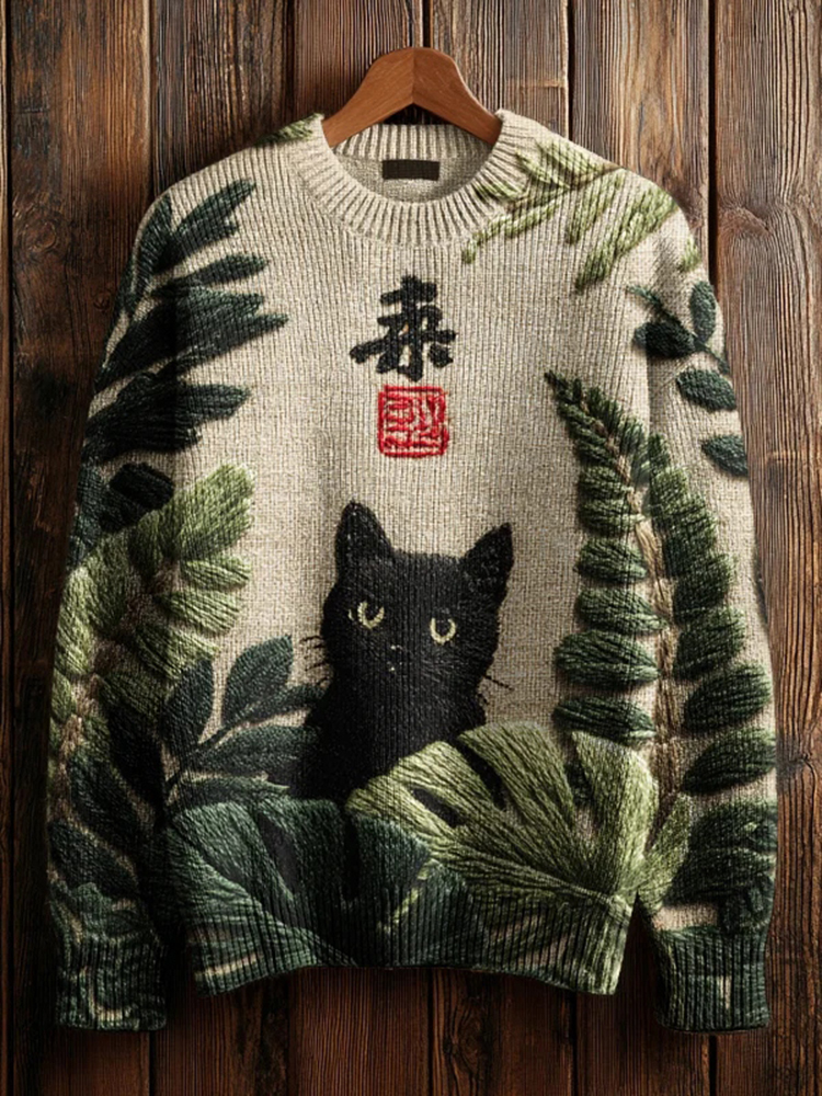 Men's Black Cat And Palm Leaf Art Print Knit Sweatshirt