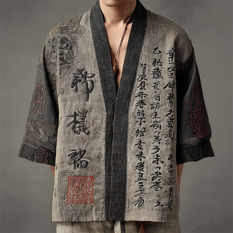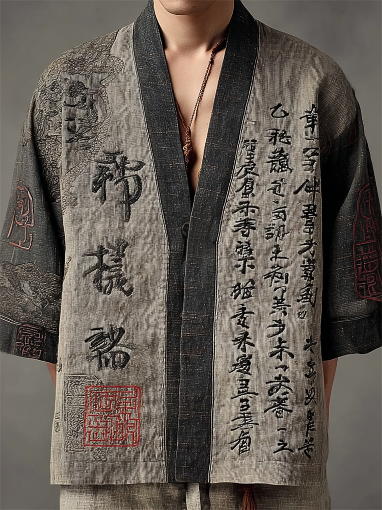 Men's Japanese Ancient Calligraphy Art Linen Kimono Cardigan