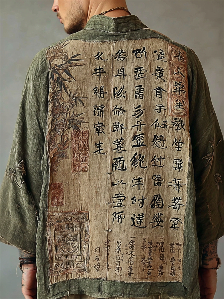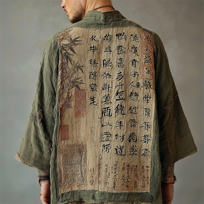 Men's Japanese Bamboo & Calligraphy Art Linen Kimono Cardigan