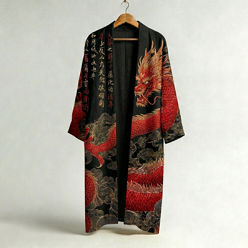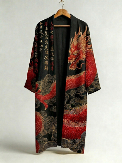 Men's Japanese Dragon Art Print Linen Long Kimono