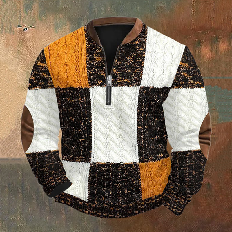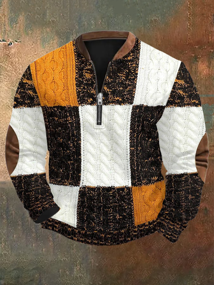 Men's Retro Western Textured Print Zipper Neck Knit Sweatshirt