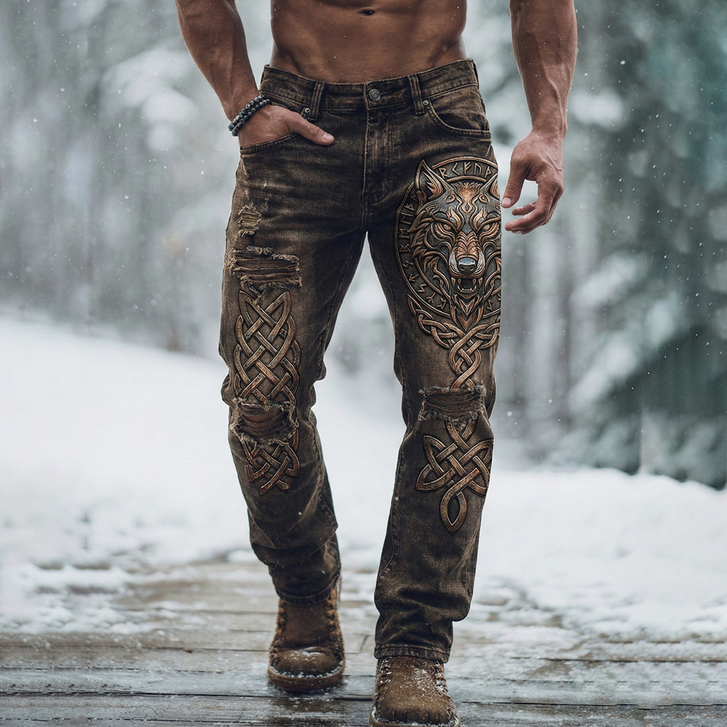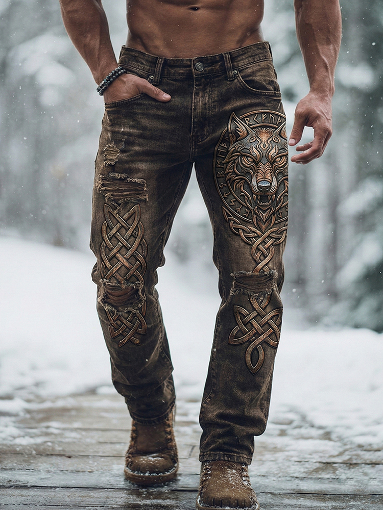 Men's Viking Celtic Knot Wolf Head Washed Jeans