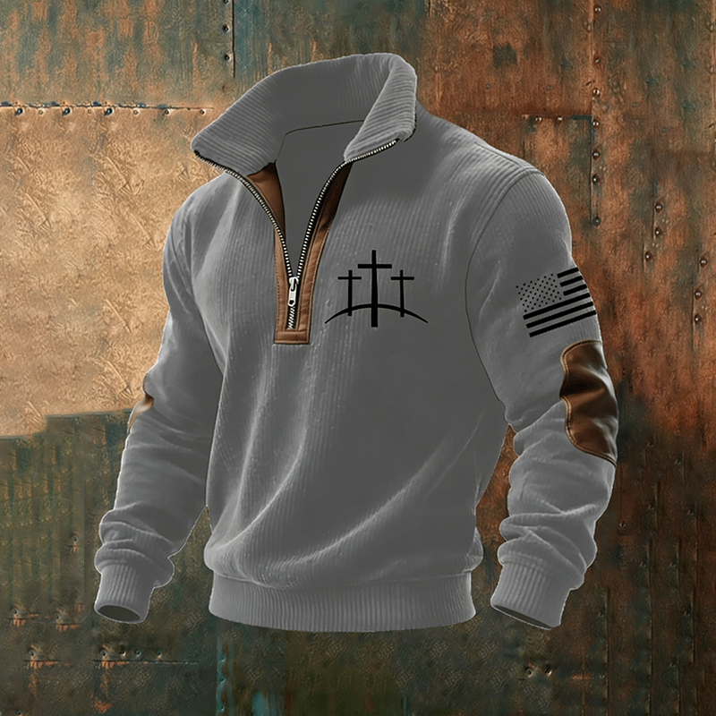 Men's Vintage Flag And Faith Print Zip-up Sweater