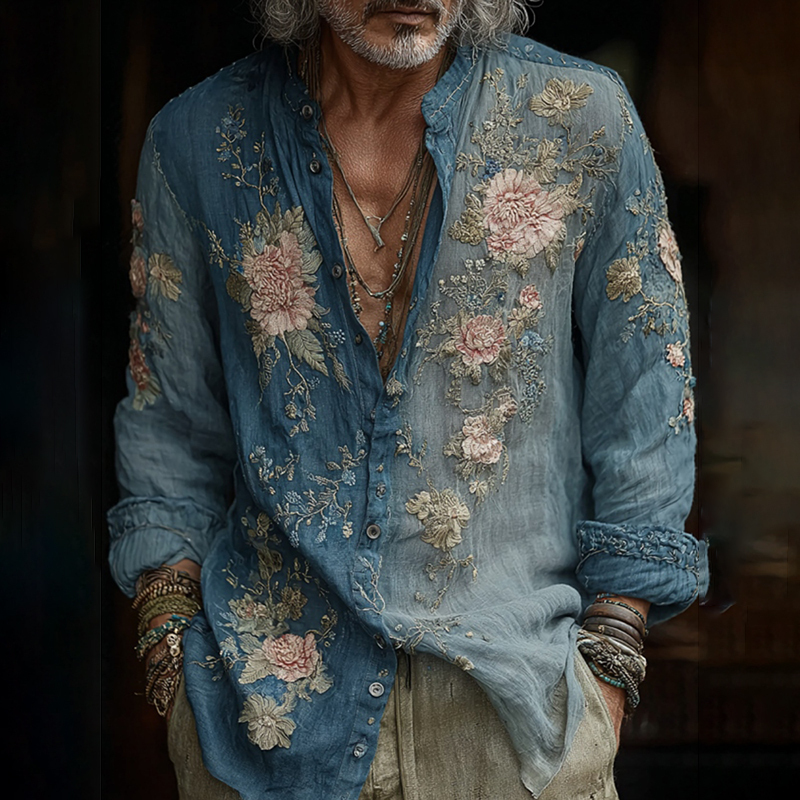Men's Vintage Floral Embroidered Comfy Linen Shirt