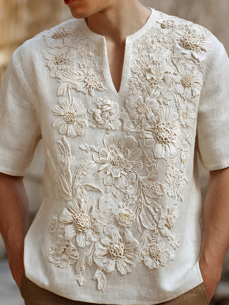 Men's Vintage Floral Lace Embroidered Linen Shirt