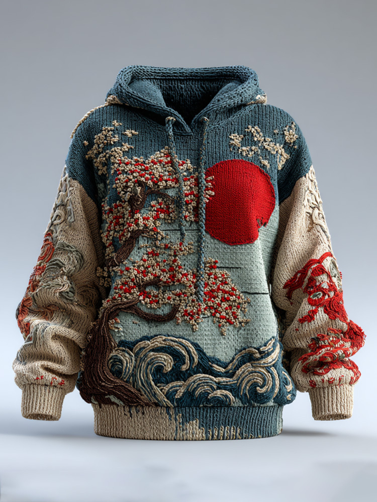 Men's Vintage Japanese Art Wave Floral Embroidered Hoodie