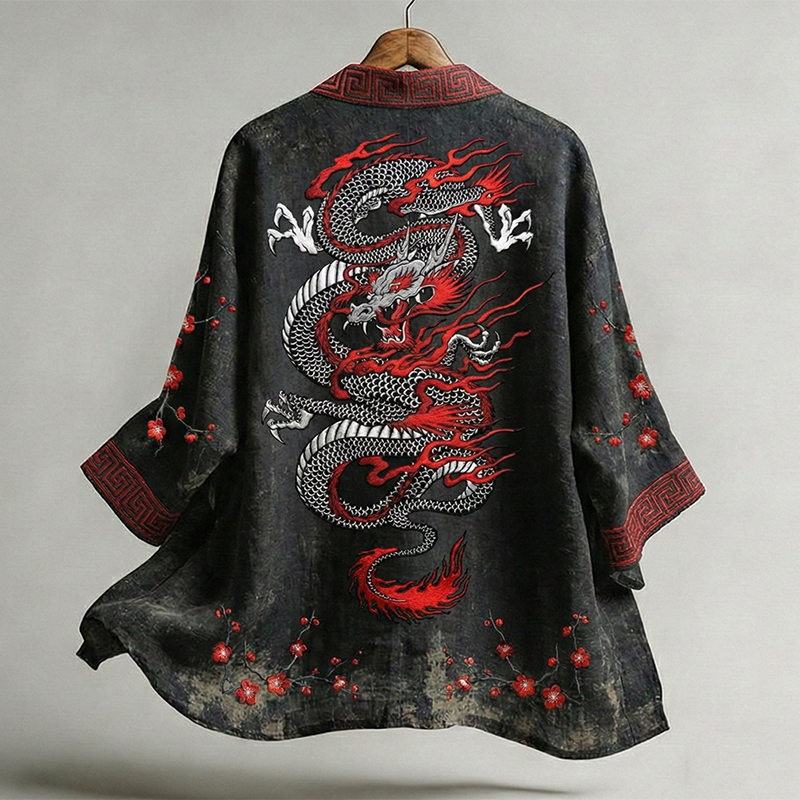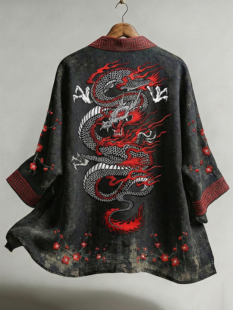 Men's Vintage Japanese Dragons Art Linen Blend Kimono