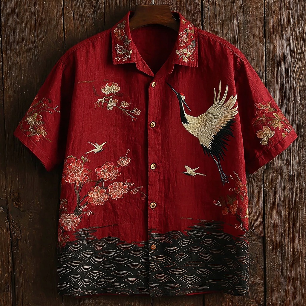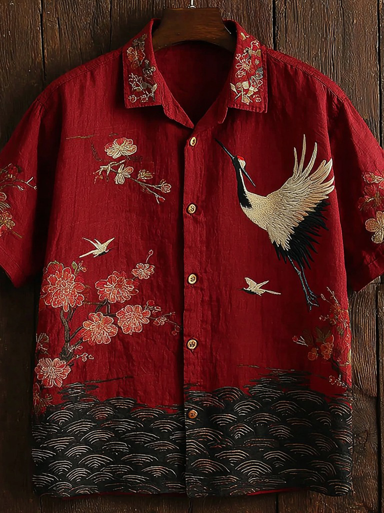 Men's Vintage Ripple Pattern And Crane Art Print Linen Shirt