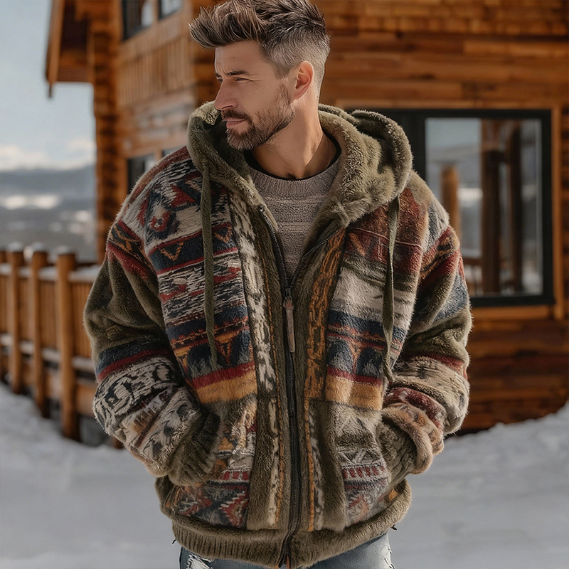 Men's Vintage Tribal Geometric Plush Warm Zip-up Hooded Sweatshirt