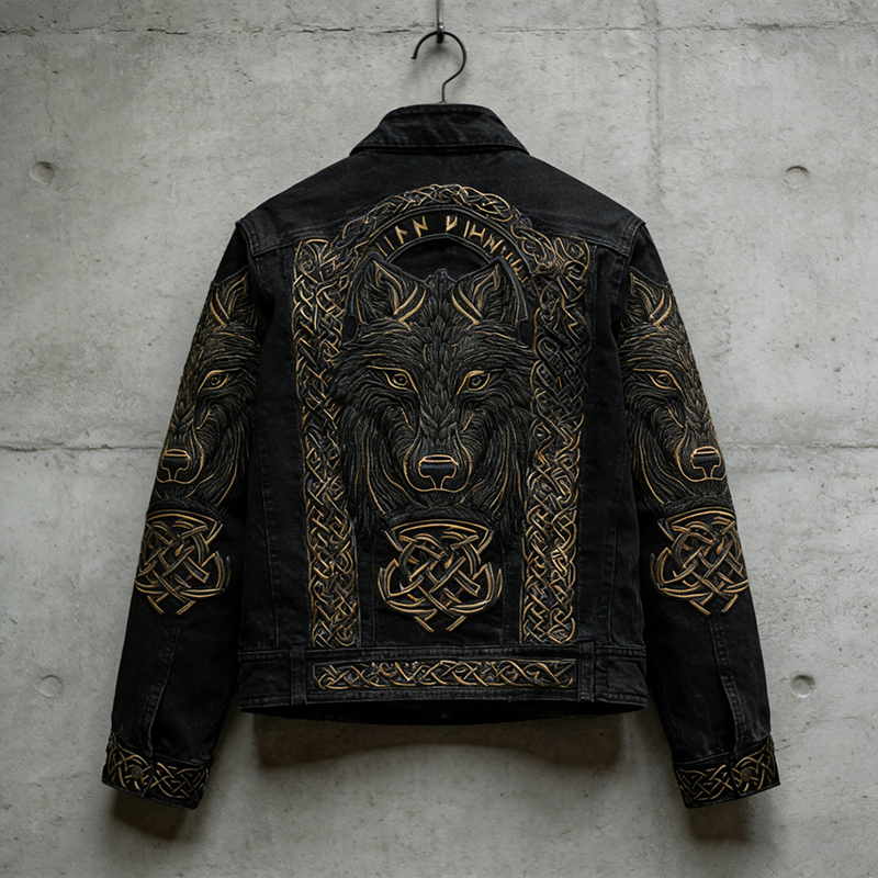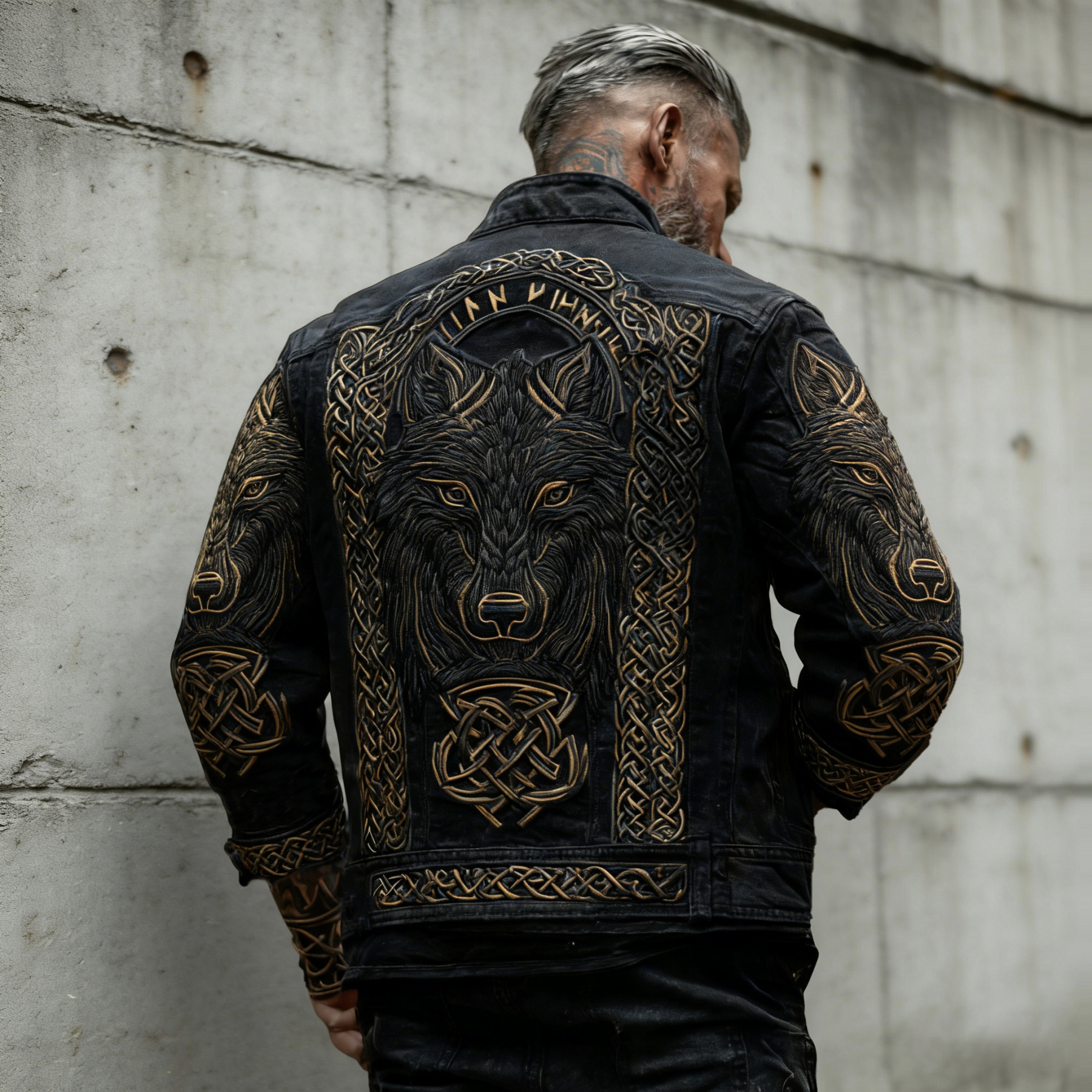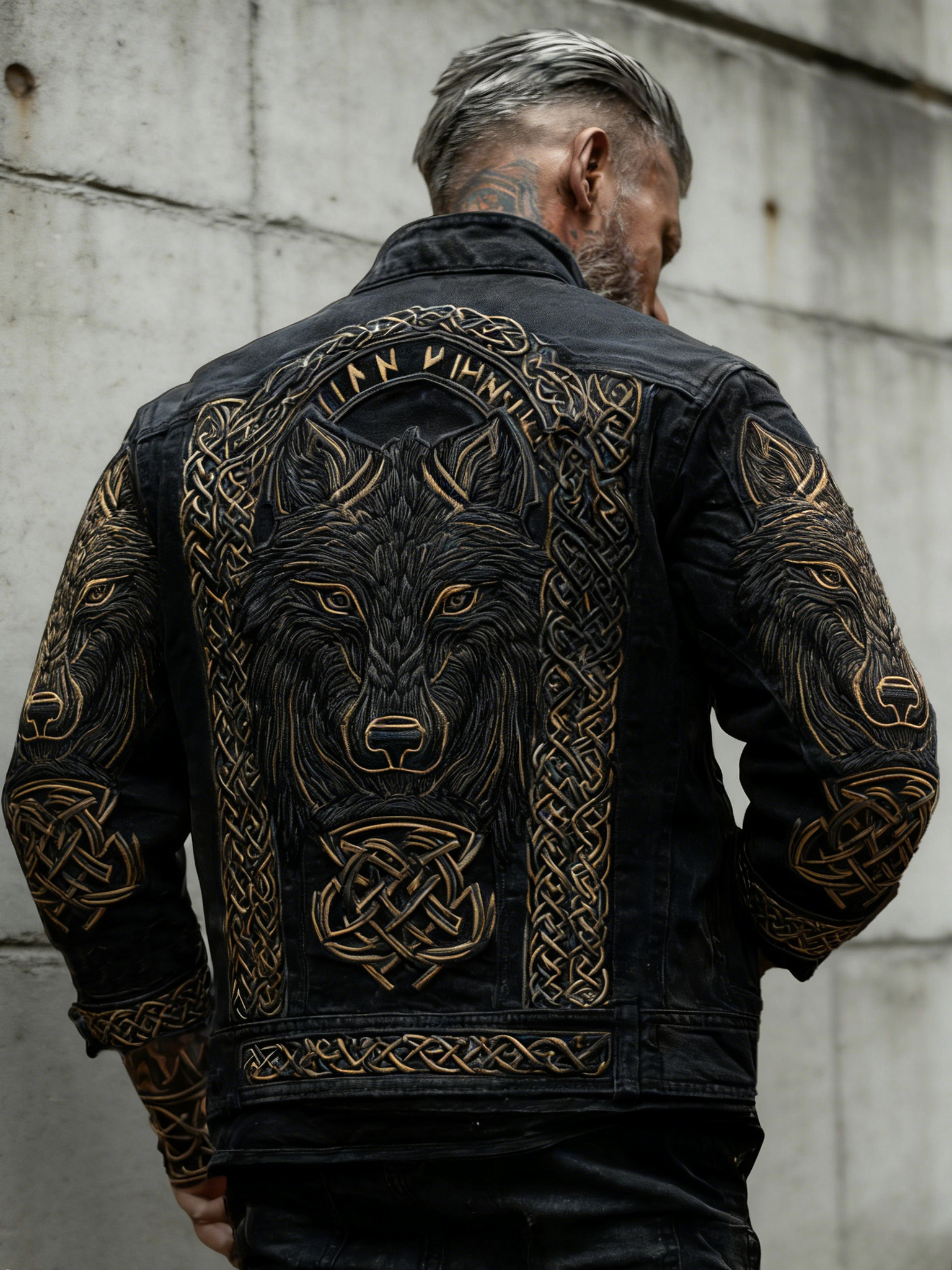 Men's Vintage Viking Celtic Wolf Art Washed Denim Jacket