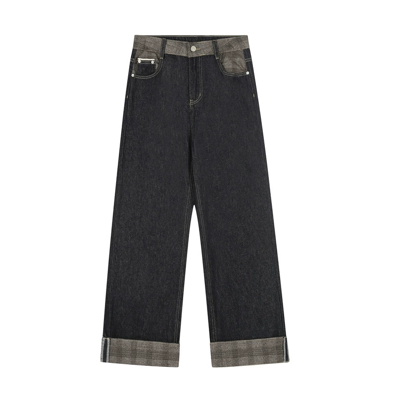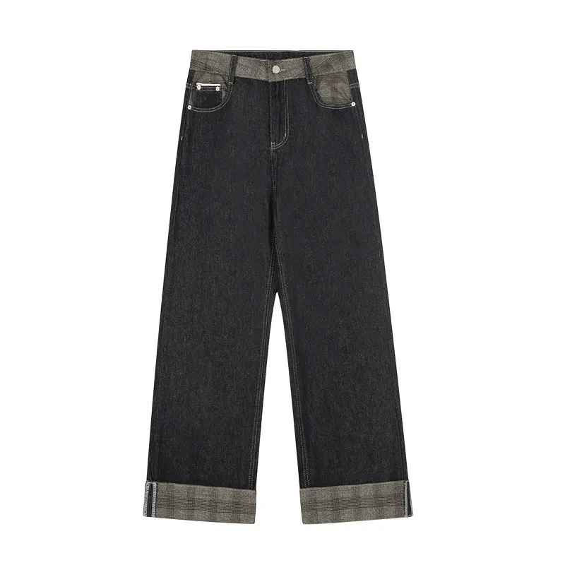 Street Color Plaid Patchwork Raw Denim Loose Jeans