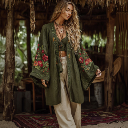 Vintage Bohemian Floral Art Embroidery Print Cotton And Linen Blend Midi-length Kimono Cardigan