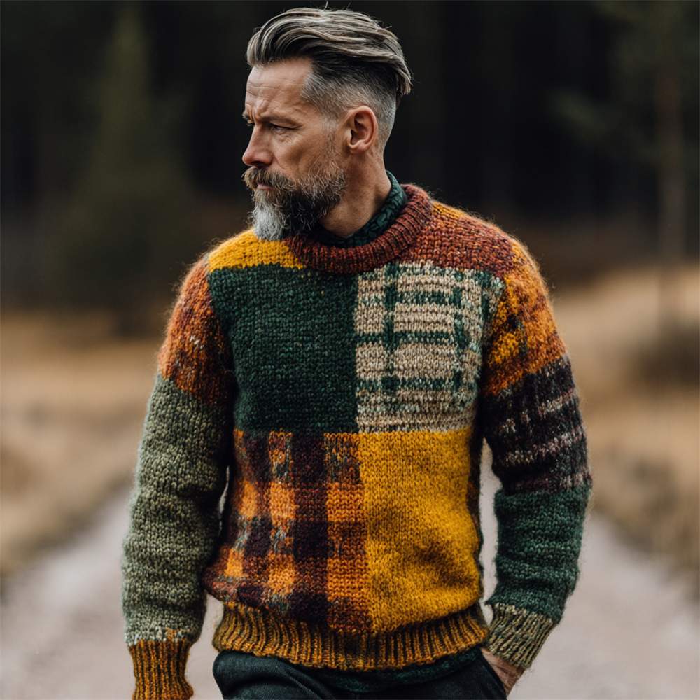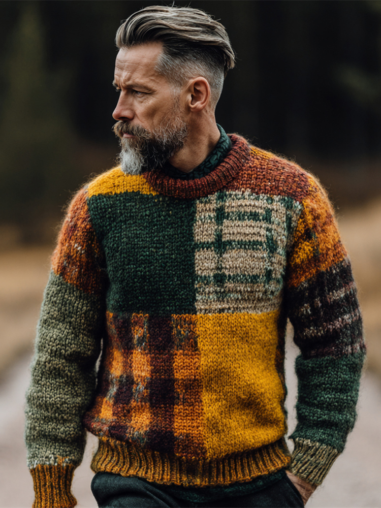 Vintage British-style Checkered Patchwork Men's Knit Sweater