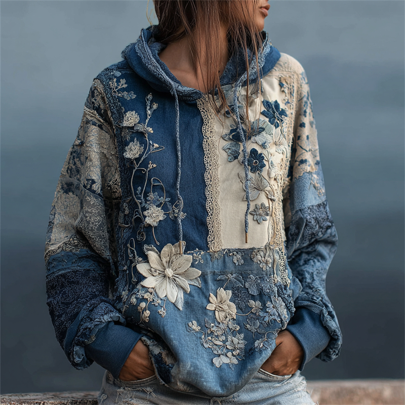 Vintage Flowers Lace Fiber Art Patchwork Hoodie